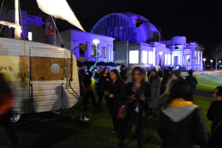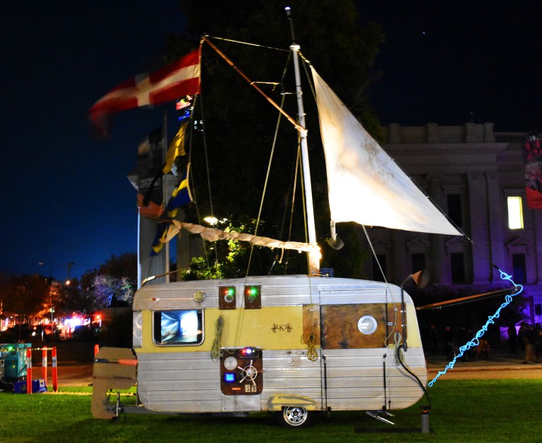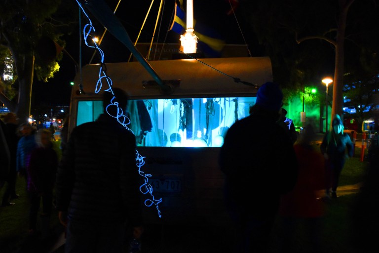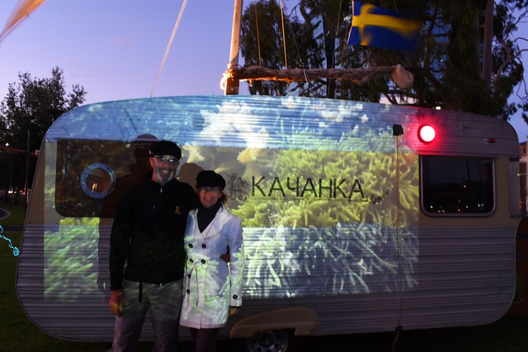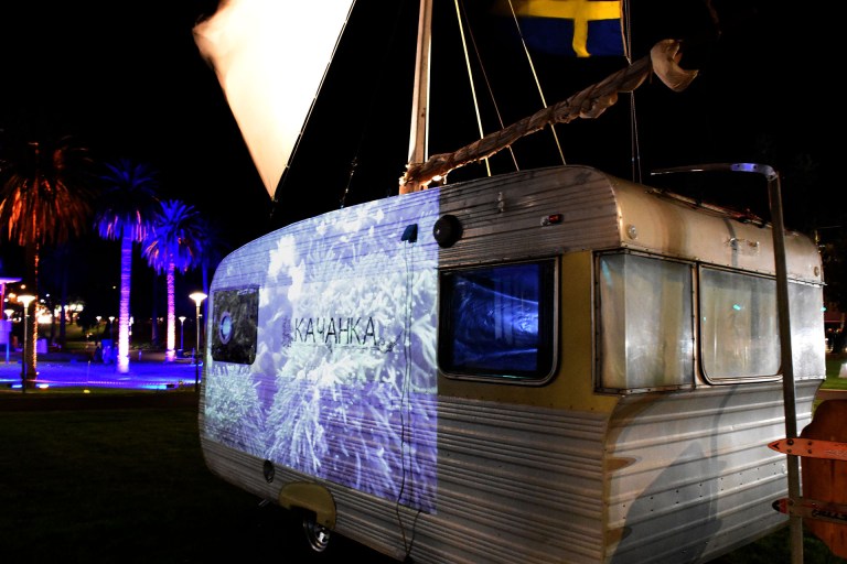 Качанка is a Russian name of the river that takes its beginning at the “Progress” village. In Ukrainian, it’s a name for a rock melon type… But in Australian folk linguistics “kachanka” means “a container for junk.” This name was given to our art machine (a project with Marita Batna) which was launched during Geelong After Dark 2018 (GAD), 4th of May 2018, as Sailing Museum-Machine. The project started with an idea for a mobile art platform that would be a hybrid machine, designed for road travel, yet representing a boat. I thought that an older caravan would be a good starting point and soon came across a 1960s Franklin caravan (most likely manufactured in Ballarat) that was buried in a building yard in the coastal town of Torquay. The work continued for several months: it turned out that the time & weather had destroyed 90% of wood and plywood structure, that had to be replaced along with the tow-bar. The internal features of the caravan were all taken out except for the shelves. The door was turned into a wall and a new opening was cut out in the place of one of rear windows to erect a door-ramp. When the structure was finished I designed and installed the gaff rig sail unit on the roof and an interactive external “controls” panel with colourful lights, wheel and artefacts of marine navigation devices. The whole artistic adventure of Качанка would not have been possible without the help and advice from my long-time boating and diving friend Craig Elstone who also gave many authentic artefacts for Качанка and was the person behind the idea of her name…