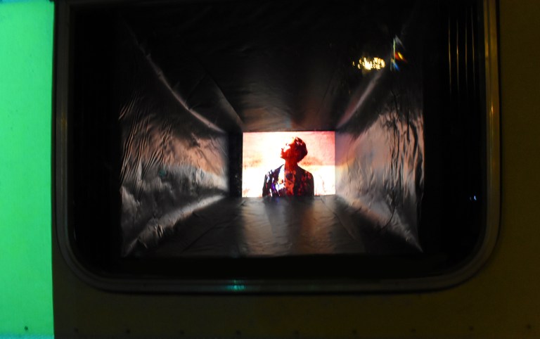 To go back in time, the original inspiration for the project was South Channel Fort, a little known man-made sea fort island hidden in the Port Phillip Bay near Melbourne, with fortification ruins, and an amazing underground tunnel system evidencing the obsolescence of what was once a key strategic military site of colonial settlement. It was built in 1880s out of fear of Russian invasion, since the gold resources in Melbourne, connected to the bay, were seen as an attraction for British enemies… Eventually, Качанка is written in Russian as a reference to this history. My cultural inspiration for Качанка aesthetics was a mix of Russian constructivism and steam punk industrial style. For GAD we presented Качанка as a mobile museum concept which also held a reference to avant-garde museology, in particular, mobile trucks that were operated as multi-functional arts cultural agitators. The show at GAD was a pilot agitation action of Creative Occupation group – an initiative that Marita has started through our artistic expeditions to South Channel Fort and its artistic occupation. Качанка is a sculptural fabulation related to the island (a boat that once might have been actively trading amongst the islands of the bay) and acts as a ‘telematic’ portal connecting to it. For this first outing, the windows of Качанка were built as tunnels and screened images taken on the island by Creative Occupation group members. The inside room was designed as a replica of fisherman’s shed with buoys, old markers, nets and tools. The underwater footage taken at South Channel Fort was projected inside and on the external wall. During the GAD night we could not set up the whole sail due to extreme wind, so we used old marine flags instead. Качанка is waiting for more public action performances with Creative Occupation group and a future mobile business related to speculative innovative technology products developed by using old media archetypes and artefacts.